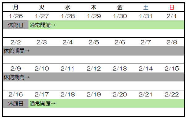 【重要なお知らせ】資料整理にともなう休館について 公開日 2025.12.05 博物館からのお知らせ 山形県立博物館は、館内収蔵資料の整理作業を行うため、下記の期間を休館します。来館をご予定されていた皆様にはご迷惑をおかけしますが、何卒ご理解くださいますようお願い申し上げます。 期間:2026年2月2日(月)~16日(月)【15日間】 この記事をシェアする: