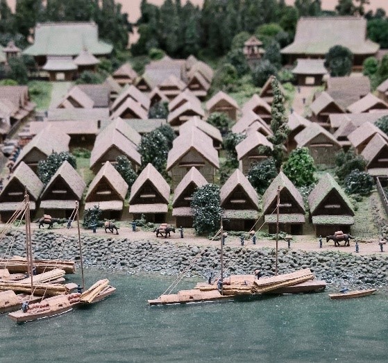 江戸時代、酒田とならび舟運の基地として栄えた大石田の港のジオラマです。よく見ると、荷物を乗せた馬が川沿いを歩いています。商人や馬や船衆が行きかう、にぎやかな場所でした。