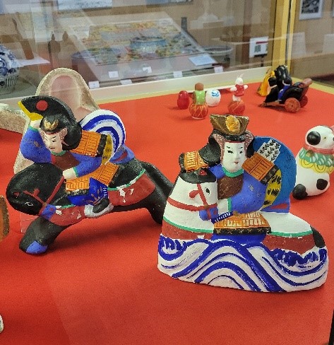 山形の伝統人形です。土人形は、馬にまたがった熊谷直実と平敦盛を表しています。正しく健やかな成長を願い作られました。わら人形は、わらが幾重にも編み込まれ迫力があります。職人技が光ります!
