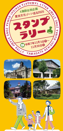 4つの施設や山形県立博物館等でスタンプの台紙(上のチラシと同じもの)を入手し、開催期間中に4施設を巡ってスタンプを集めてください。各施設の開館時間や休館日、プレゼントの内容や応募方法などはチラシをご覧ください。
